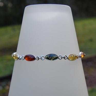 This is a high quality silver and mixed amber bracelet which has been made with real Baltic Amber in leaf-shapes and in yellow, orange and green colours. Elegant and easy to wear with a trigger catch and jump ring fitting to fasten.