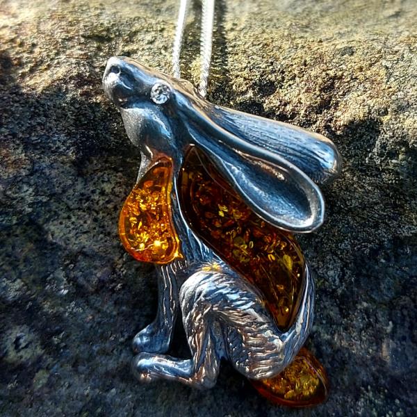 This is a stunning piece of sterling silver jewellery set with real Baltic amber in an iconic hare design. The sparkling cubic zirconia eye adds more energy to its powerful symbology. Sold on 18" sterling silver chain.