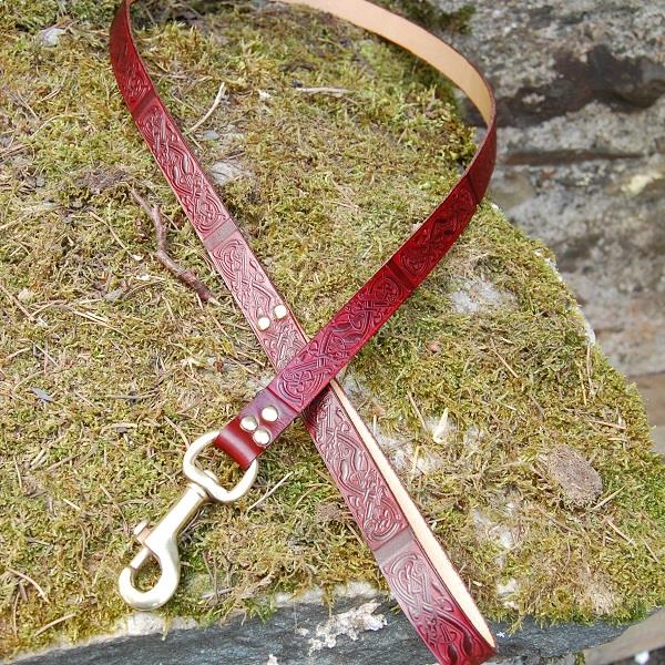 Available in a variety of hand-dyed leathers: natural/oak (pale with dark brown), tan/chestnut red (orange with dark red) or chestnut red/oak (dark red with dark brown) - which highlight the fine Celtic details. Alternatively, for a more subtle finish, leads made using brown full-grain Italian leather (pre-dyed), show the design as more of a texture.