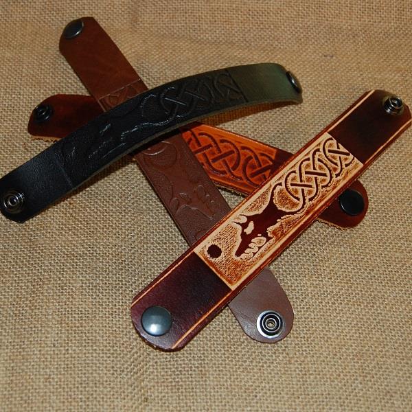 A medium width Leather Wristlet which has been pressed with our original 'Celtic Wolf & Moon' design, finished with a popper.